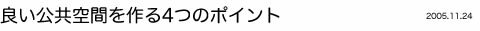 良い公共空間とは、驚くほどシンプルなものである。Project for Public Spacesというアメリカの団体は、1000カ所を越える公共空間を評価し、非公式なものを含めると1万カ所以上の公共空間の調査を行った結果、大規模なプラザから小規模な近隣公園にいたるまで、良い空間というものは、次の4つの重要なポイントを共有していることを発見した。