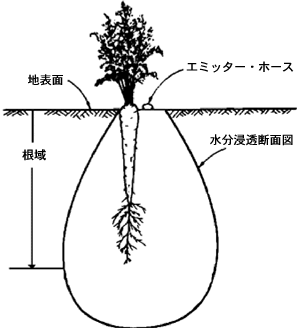 ドリップ灌漑によるウエットプロフィール(水分浸出断面図)は、図1で示されるように植物の根域中で発達し、その形状は土壌特性に依存する。ドリップ潅漑は、植物の根域だけが水分を受け取るので、水を節約し、エミッターの作物の畝と畝の間のエリアは乾燥していて、偶発的な降水からのみ水分を受け取るという理想的な状態を作り出す。そして適正量が灌漑されているならば、根域よりも深い浸透によって失われる水はほとんどない。