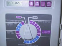 同じ植物でも必要とする水量は季節によって変わる。その植物の要求にあわせるために、コントローラーの実行時間は季節と共に変更しなければならない。これがプログラムである。想像がつくと思うが、植物は、事実として、肌寒い春や秋に必要とする水量は夏よりも少ない。例えばブルーグラスの芝生は、春や秋には1週間につき約15~23mmの水を必要とするが、真夏には1週間につき約32~38mmの水を必要とするようになる。こうした変化する水需要に対応して、コントローラーの中には、ピークの夏の実行時間に対する何パーセントという設定ができるものがある。 1つ設定を変更すれば、春秋にはその60パーセントの割合で灌水するというふうに、容易にリセットすることができる。 (図1)
