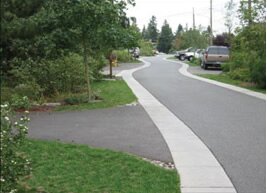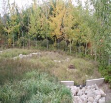 樹木は、根系の小さい種類を選んでいるため、道路の脇に容易に収めることができた。そして、湿地で生長する植物は、降雨の流れ込むこの低湿地と池の中でも、より低くて湿った場所に配置されている。さらに道路では交通往来を低速化し、道路の不浸透性表面を削減するために、道路自体を曲折して狭くなるように設計したが、それにより、道路の不浸透性面は11%縮小した。