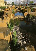 バイオ低湿地は、雨水からの汚染物質をろ過する芝とスゲとラッシュを植えた場所で、道路の両脇に沿って広がっている。