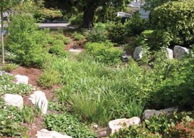 雨の庭は、敷地で降雨を管理しつつ美的にも優れたランドスケープ機能を作り出す。それは簡単で楽しい作業である。その庭は、家や周囲のランドスケープからの余剰的な雨水流出が流れ込むように設計されて植栽されたくぼ地であり、植物はスゲやラッシュ、シダ、低木、樹木の中から余剰水を吸収し、蒸散というプロセスを経て水を大気へ還元するのに適した種類が選択された。
