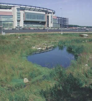 ニューイングランドのパトリオット建物(会社)の新しいジレットスタジアム(2002年に竣工しオープン)は、マサチューセッツ州フォックスボロ(Foxborough)で長さ3,300フィートにわたるネポンセット川の拡張を復原する機会を提供した。ネポンセットの場合、川の復原は、新しく68,000席の多機能スタジアムを作るにあたって必要とされる、大規模な新駐車場のニーズと一致した。敷地には1940年代に旧競技場が建てられ、川は再編成され、競技場の上下流域は下水管によって地下に埋められていた。ネポンセット川の沈泥が詰まった下水管になっている部分と開渠している部分は、ちょうど旧競技場を横切り、そして、新しいスタジアムの計画地-まさに最も駐車が必要な場所に隣接して流れていた。新しいスタジアムは施設の近くに駐車を必要としており、ネポンセット川は、「デイライティング daylighting」され、復原される必要があった。両者のゴールは、ネポンセット川復原プロジェクトにて成し遂げられたが、それは新しいスタジアムのできる数ヶ月前に完了した。