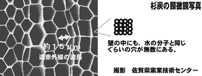 木や竹からできた炭は、木材と同様に、縦にも横にも通じる細いパイプを束ねたような組織構造になっている。その太さ、構造は樹種で多少異なるが基本的に同じである。その孔の大きさは直径数ミクロン(1ミクロンは1/1000�@)から数100ミクロンのものもある。木炭を切断し、電子顕微鏡で200〜500倍に拡大すると、その断面が蜂の巣のように、網目状になっているのがわかる。樹木の細胞そのままが空間になった、多孔質と呼ばれる構造である。その孔の大きさに相応して、特に細菌や放線菌など通常ではあまり増えない多種の微生物が共生できるようになり、それが土壌の中の植物の根の生長を促進したり、水、空気の浄化がされたりといった効果をもたらす。