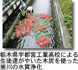都市排水、産業排水、農薬や化学肥料の流出による水質汚濁がますます深刻化する河川において、木炭を沈めることで 悪臭の軽減や自然生物の回復など、大きな浄化効果が認められている。