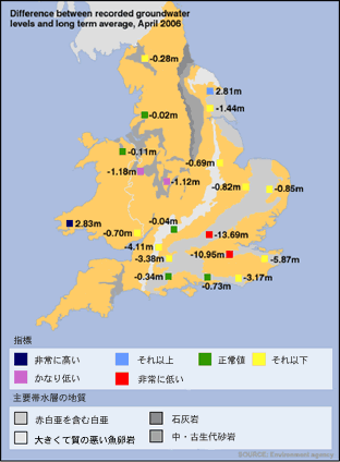 英国では、秋から冬(10月~3月)は一年で一番多く雨が降る時期で、この時期の雨が貯水池や地下水を涵養するおかげで、春や夏の時期に水が安定供給できるという。現在のイングランド中央および南部地域の水不足は、去年今年と冬の時期が2年に渡って乾燥し雨不足だった上に、詳しく言うなら、昨年11月~今年5月までの平均降雨量が、平年の6割程度という結果による。いまや夏に向けて水不足の危機が迫っている状況である。わずか北部だけが、ほぼ平年値の雨量となったが、それ以外の地域では、現在までに例年通りの地下水が十分に補充されず、その結果ほとんどの地域で地下水位が平年値よりマイナスに転じている。