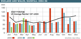 イングランドとウェールズの過去平均月別降雨量と2004-6年の月別降雨量対比グラフ
