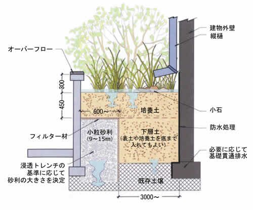 浸透性プランターというのは、フィルター機能を持ったプランターのことで、イメージとしては、底の抜けたプランターを地面に設置した感じである。植栽地でなく植栽マスの類で、三方あるいは周囲を縁取った花壇形とするので、便宜上プランターと呼ぶ。壁の材質が透水性なのではなく、その立体空間全体に、水を浸透しろ過するフィルターの役目を持たせたものを言う。