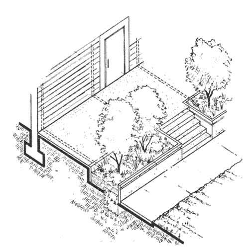 玄関アプローチの両脇に設置してもよいし、バックヤードのテラスに隣接する形で設置することもできる。破線で示しているように、建物屋根からの集水管をプランターまで引き込むことが肝心なため、建物に近接して設置するのが一般的である。